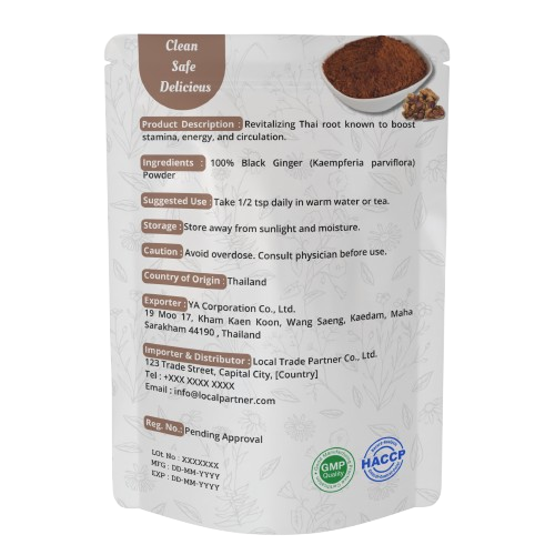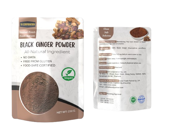 Revered in traditional Thai medicine, this 100% Pure Black Ginger Powder (Kaempferia parviflora) is known for its ability to boost stamina, energy, and circulation. Carefully processed from dried black ginger rhizomes, this powder can be brewed into herbal tea, mixed into drinks, or used as a functional supplement in daily wellness routines.