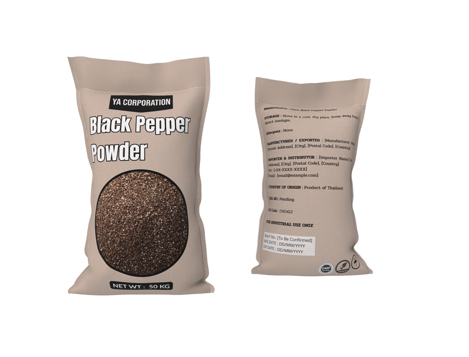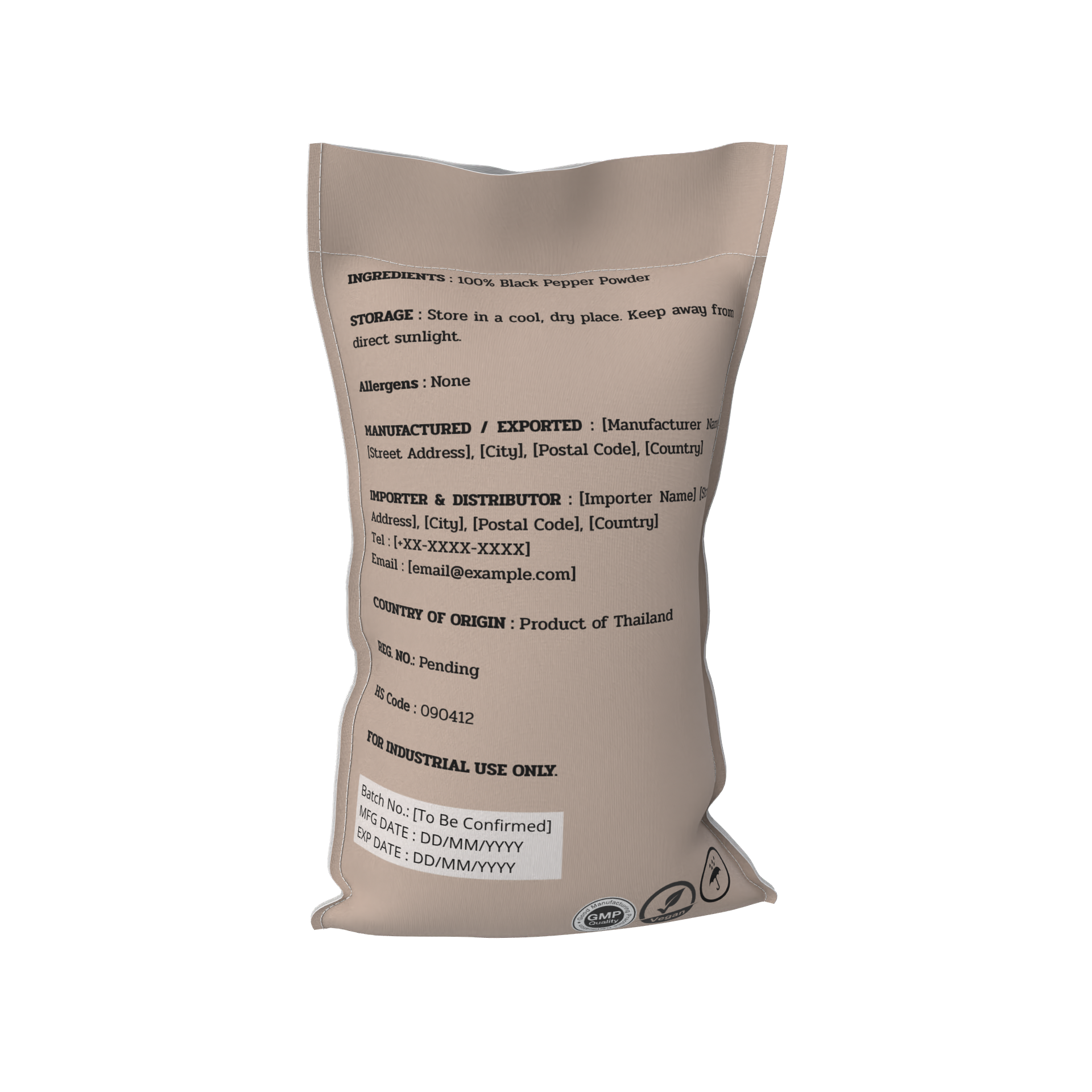 Primary pack : Laminated food-grade pouch (100 g / 250 g / 1 kg) or bulk sack (25–50 kg)