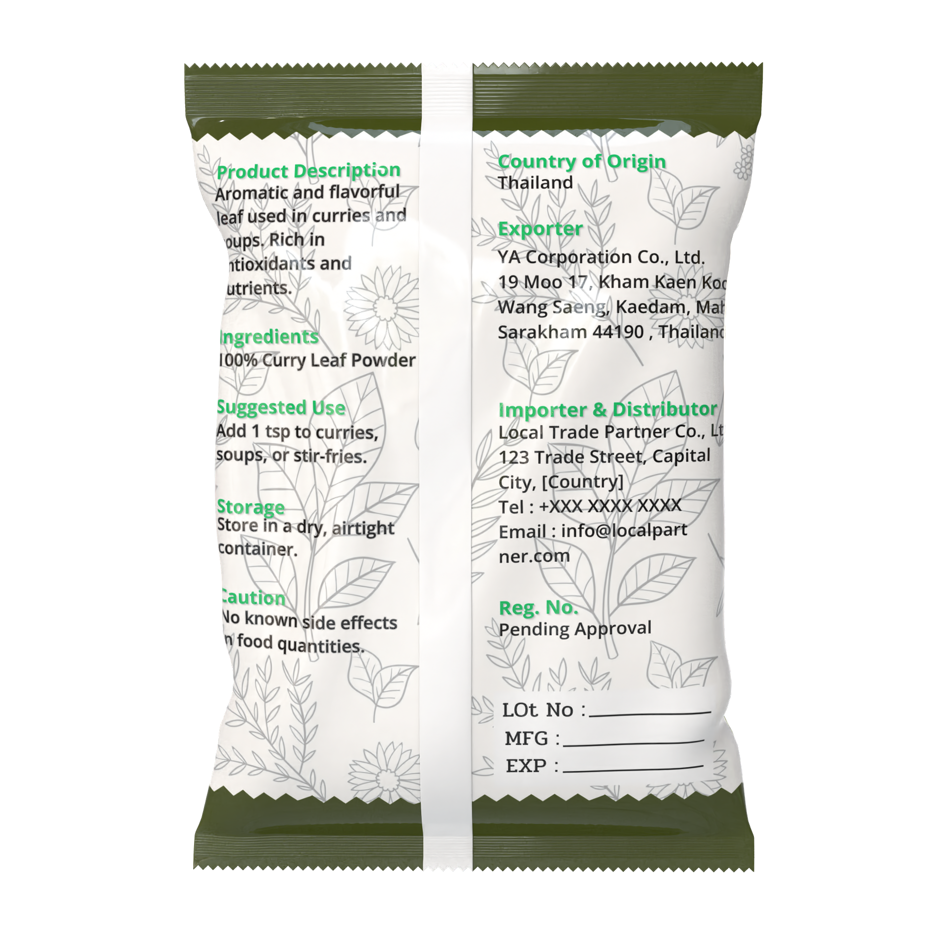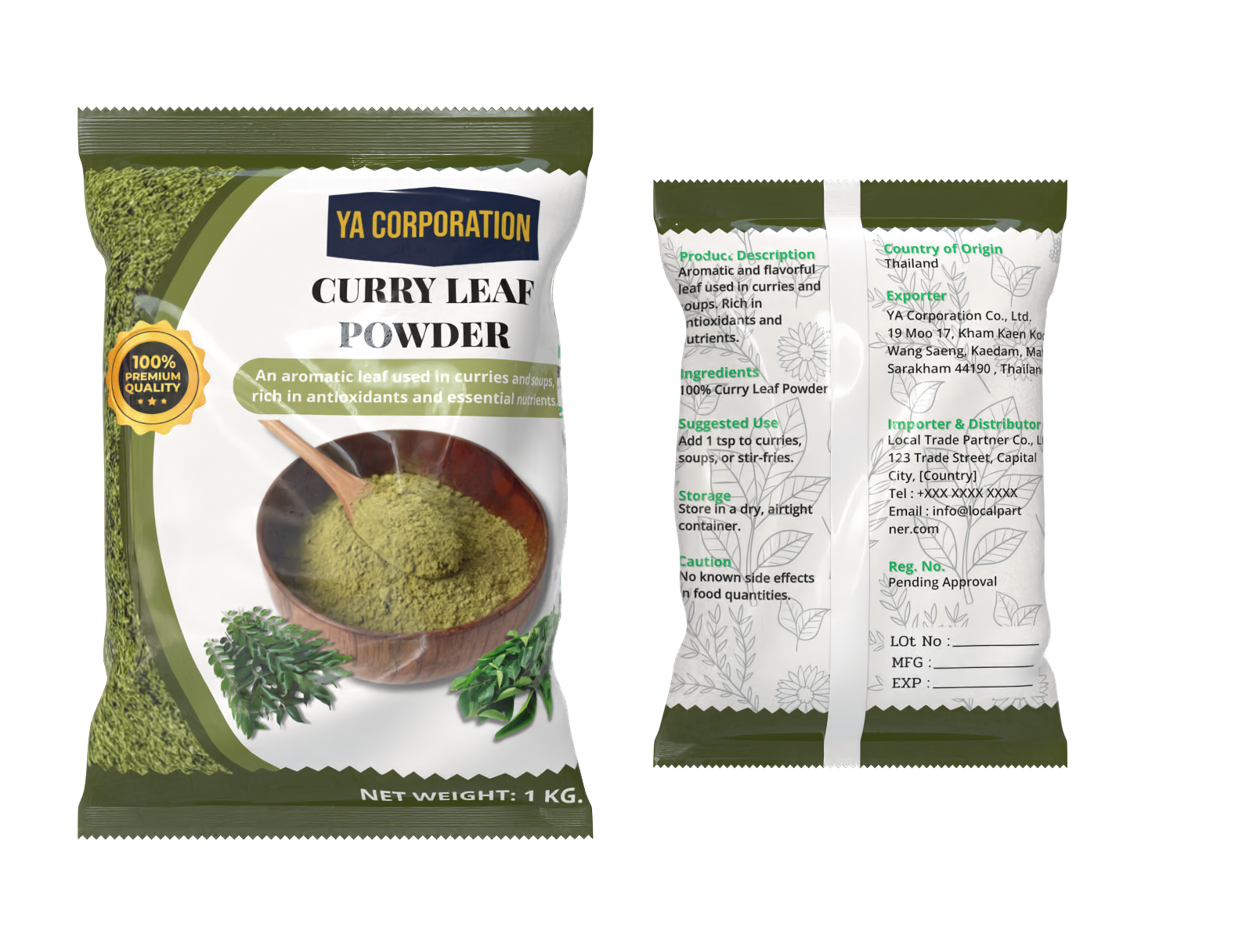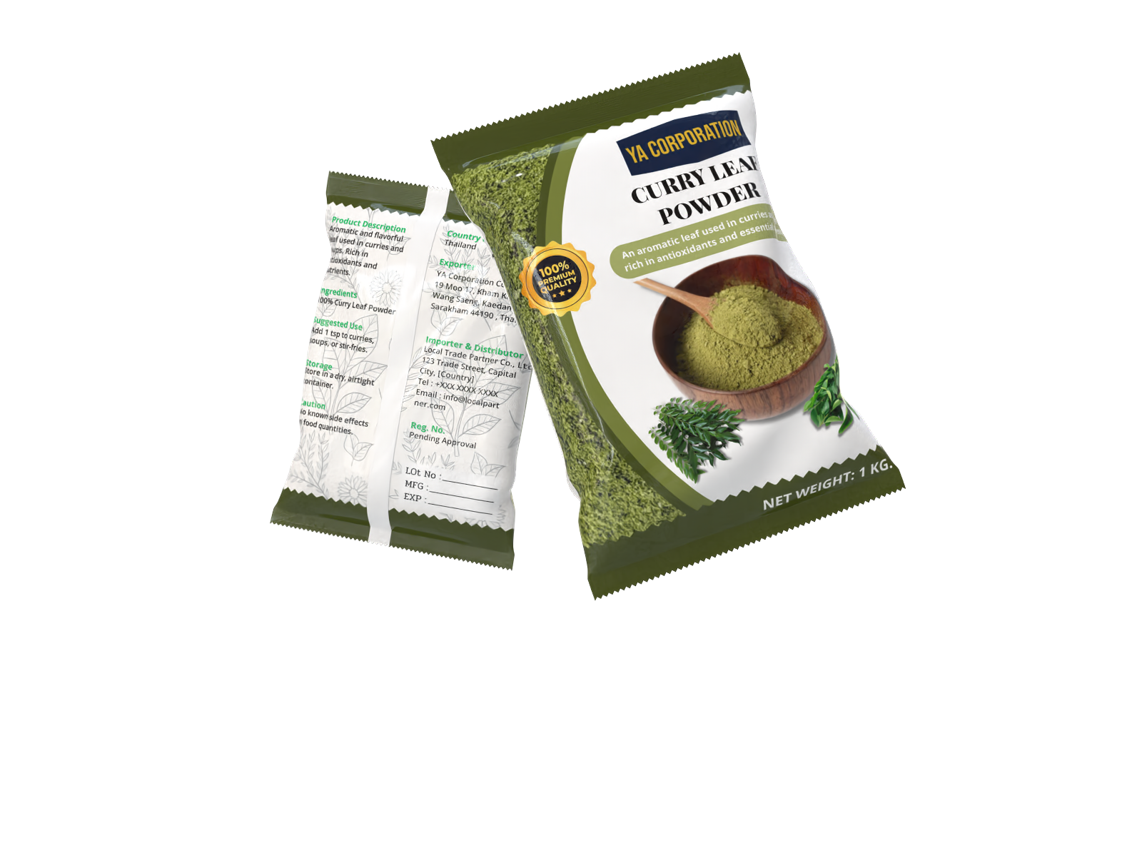 An aromatic leaf powder made from 100% dried curry leaves (Murraya koenigii), prized for its fragrant flavor and rich antioxidant content. Perfect for enhancing curries, soups, sauces, and seasoning blends while delivering essential nutrients in every pinch.