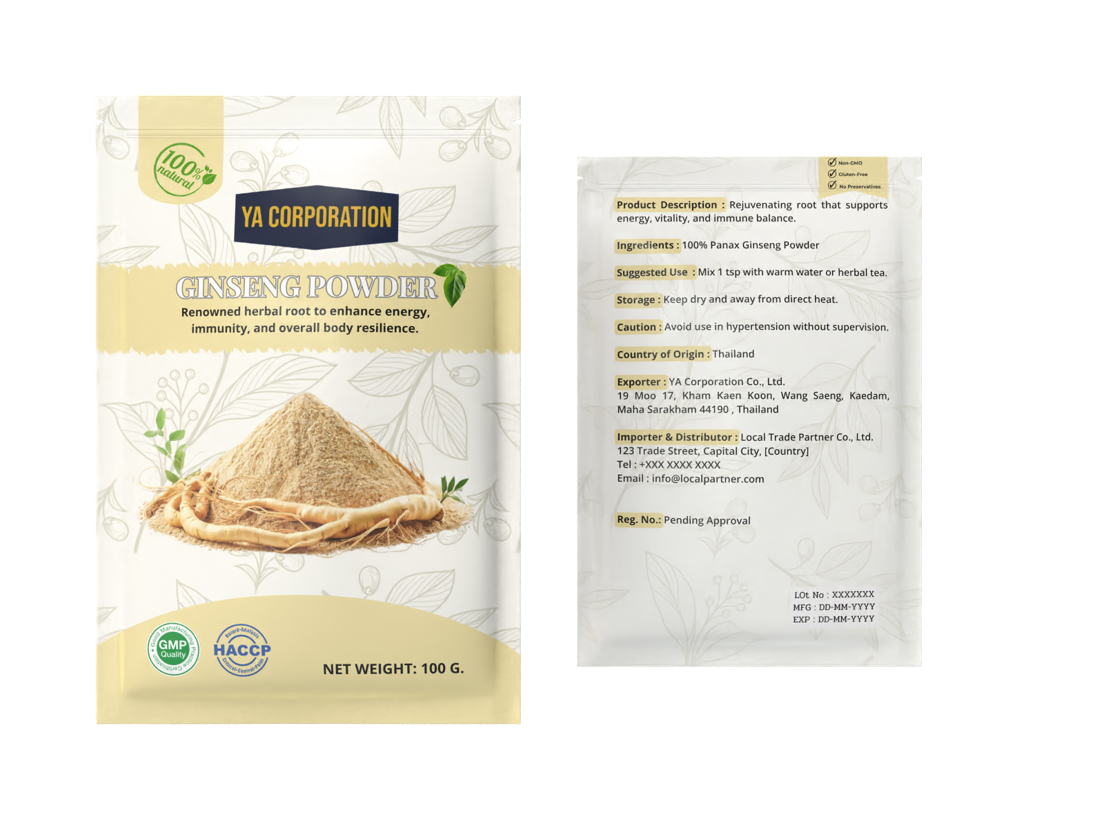 Primary pack : Laminated food-grade pouch (100 g / 250 g / 1 kg) or bulk sack (25–50 kg)